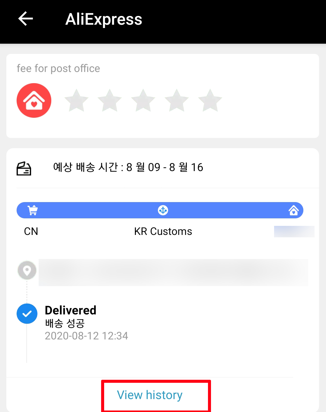 그럼 주문한 상품의 판매자가 물품을 배송 처리를 시작했으면 배송관련 자세한 사항들이 나옵니다. 저는 이미 배송이 완료된 상품을 배송 조회했기 때문에 최종 제품의 배송 상태가 배송 성공으로 나오고 있습니다. 더 자세히 보고 싶으면 view history를 클릭해줍니다