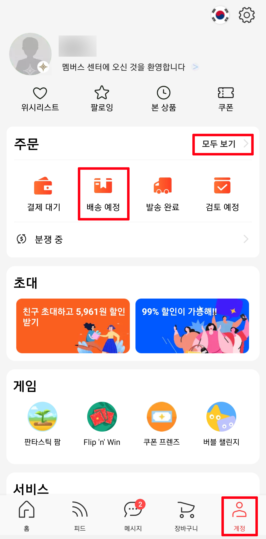 알리익스프레스 앱을 실행했다면 하단에 계정을 클릭해줍니다. 그러면 주문이라는 곳에 옆에 모두보기를 클릭해주거나 배송 예정으로 클릭해서 들어가면 됩니다