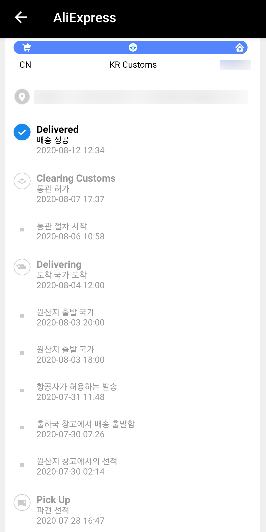 view history로 들어가면 판매자가 물품을 배송하고 그 다음 절차들을 자세히 볼 수 있습니다. 여기서 배송 성공 전 통관 허가 중 바로 배송이 와야 되는데 오지 않는 경우가 간혹 있습니다. 뭐가 문제인지 모르겠는데 통관 허가에서 오래 걸리는 경우가 있다고 하네요