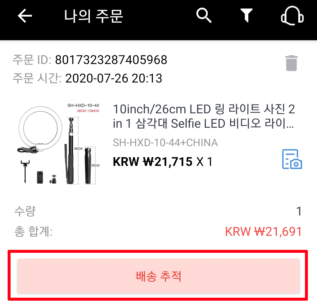 그럼 주문 한 내역들이 보이고 그중 배송 조회할 상품에 배송 추적 버튼을 클릭해줍니다