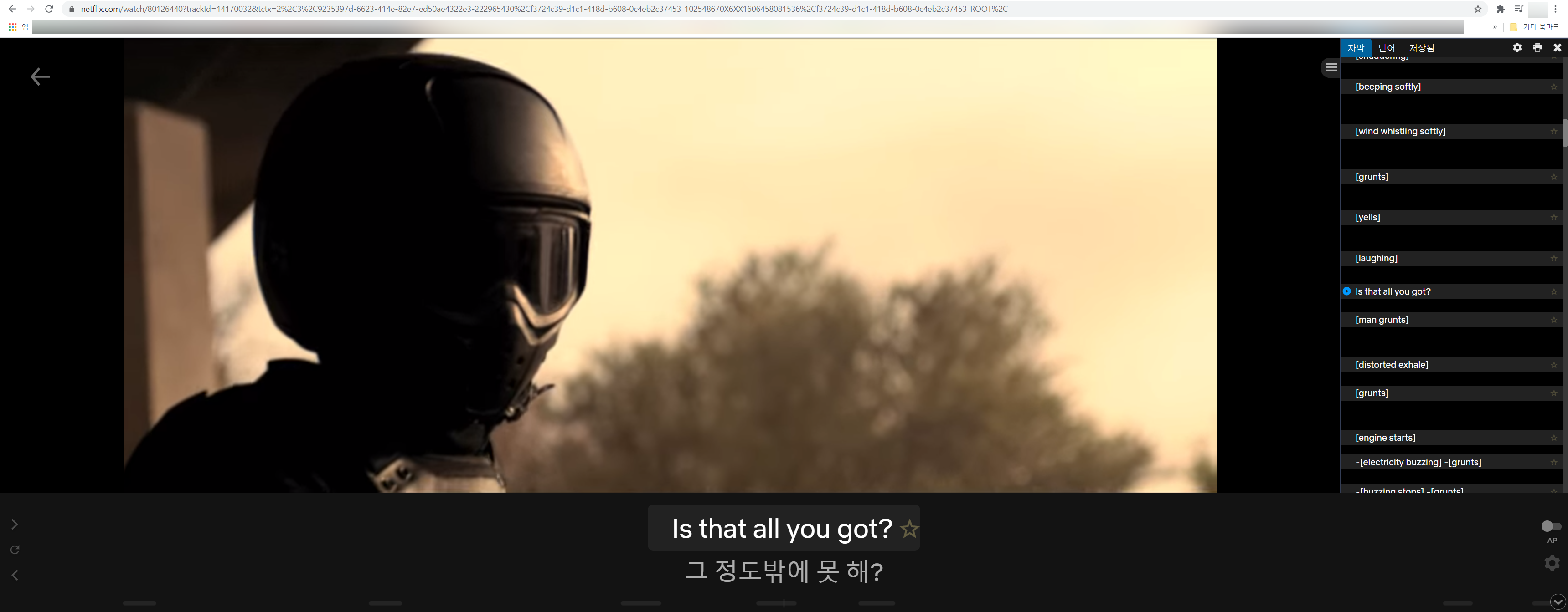 그럼 대사가 나오는 시간 때에 영어자막과 한글자막이 동시에 나오는 걸 확인할 수 있습니다. 그리고 오른쪽에는 전체 대사가 영어로 나와있는 걸 확인할 수 있습니다