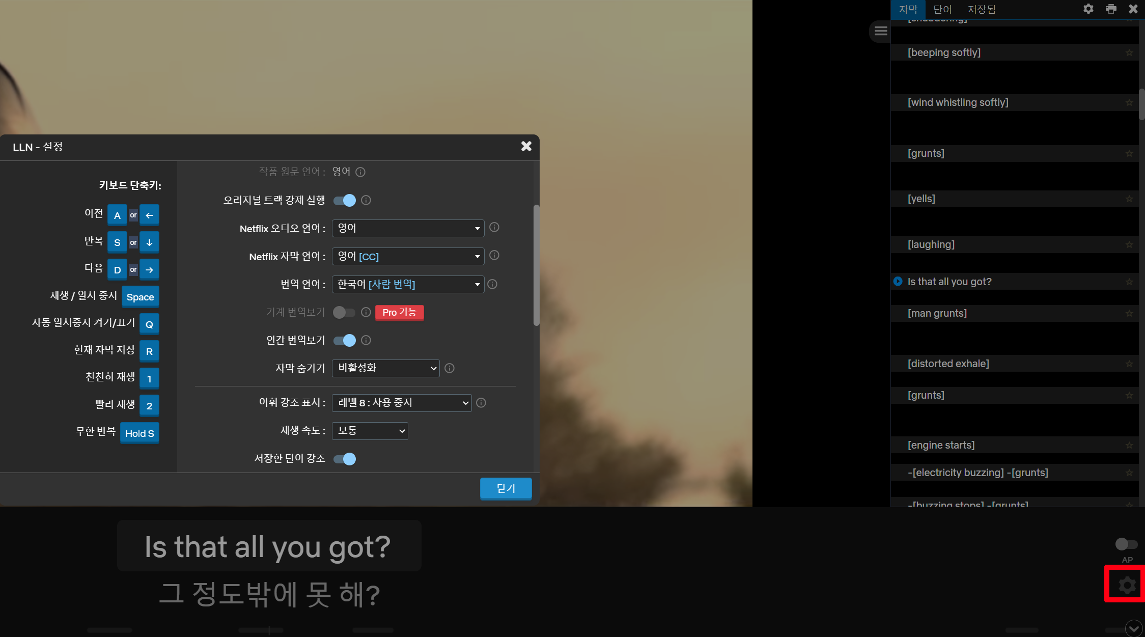 영상 오른쪽 하단에 톱니바퀴 아이콘을 눌러줍니다. 그럼 LLN설정이라는 창이 뜨는데 거기서 번역언어를 설정해주고 다른 설정들을 할 수 있습니다. 천천히 재생하거나 반복 재생 또는 빨리 재생 무한반복 등 외국어 공부할 때 유용하게 사용할 수 있는 기능들이 많습니다